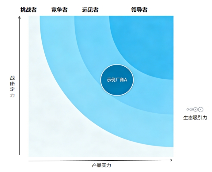 最終,我們不會(huì)簡單排出123名,而是繪制出"引力象限圖":X軸代表企業(yè)當(dāng)前的產(chǎn)品實(shí)力,而Y軸則代表企業(yè)當(dāng)前產(chǎn)品戰(zhàn)略,圓圈大小則代表生態(tài)吸引力。同時(shí)引力象限被劃分為四個(gè)區(qū)域——領(lǐng)航者、遠(yuǎn)見者、競爭者、挑戰(zhàn)者。這種二維定位比線性排名更能反映企業(yè)的真實(shí)處境。